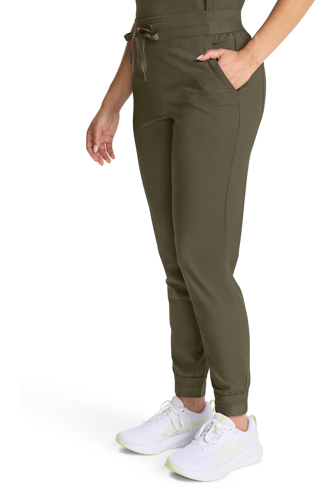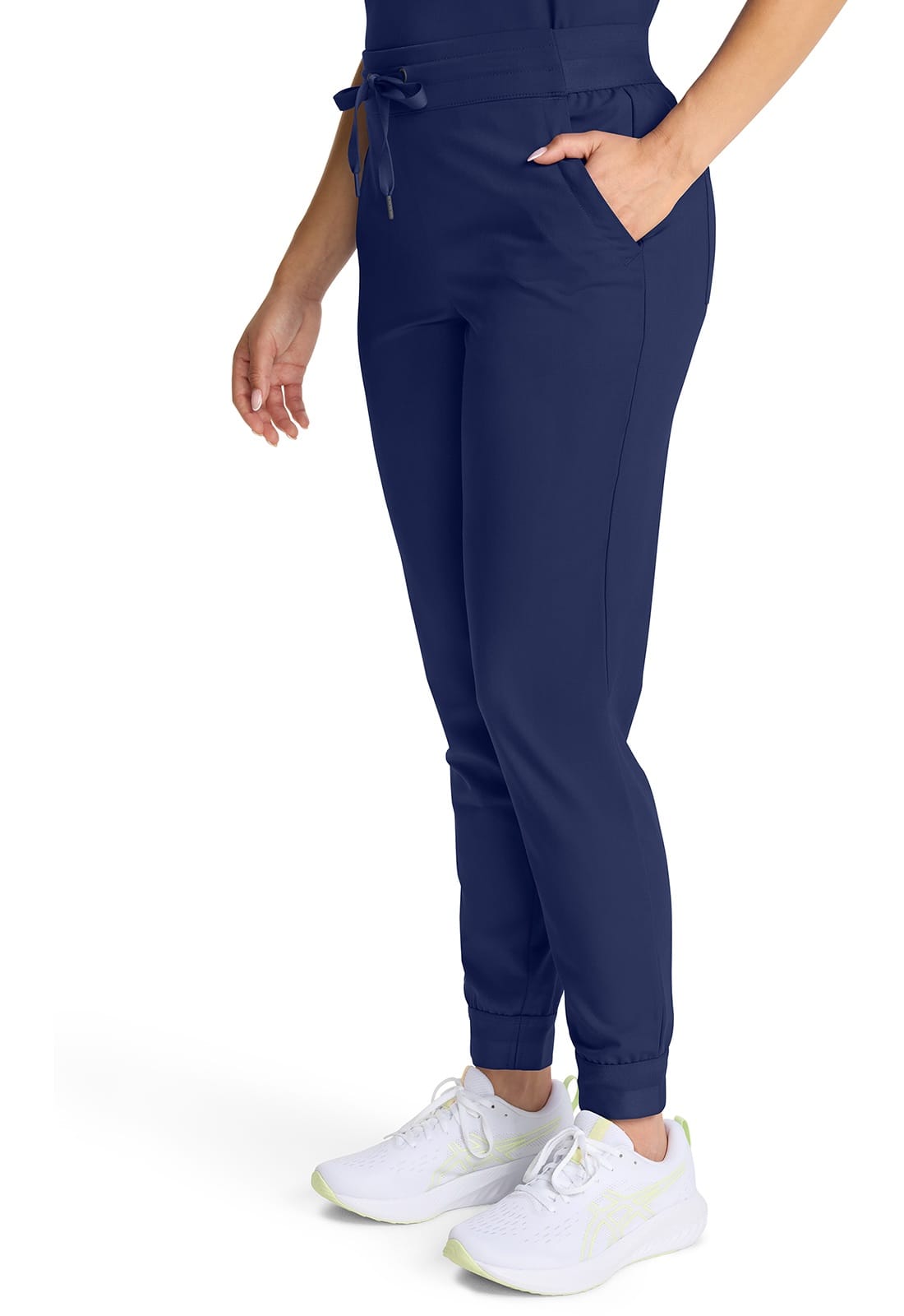 Perfect for work-to-weekend wear, the drawstring jogger boasts exceptional design details. The mid rise flat front waistband gives a smooth look while the patterned back elastic provides a secure fit. There are five pockets for organized storage: two front slant pockets, one zipper cargo on the wearer¿s right side, and two back patch pockets. Pockets include pretty printed pocket bag. Decorative elastic cuffs. The soft four-way stretch fabric includes moisture wicking for added comfort. Modern fit.